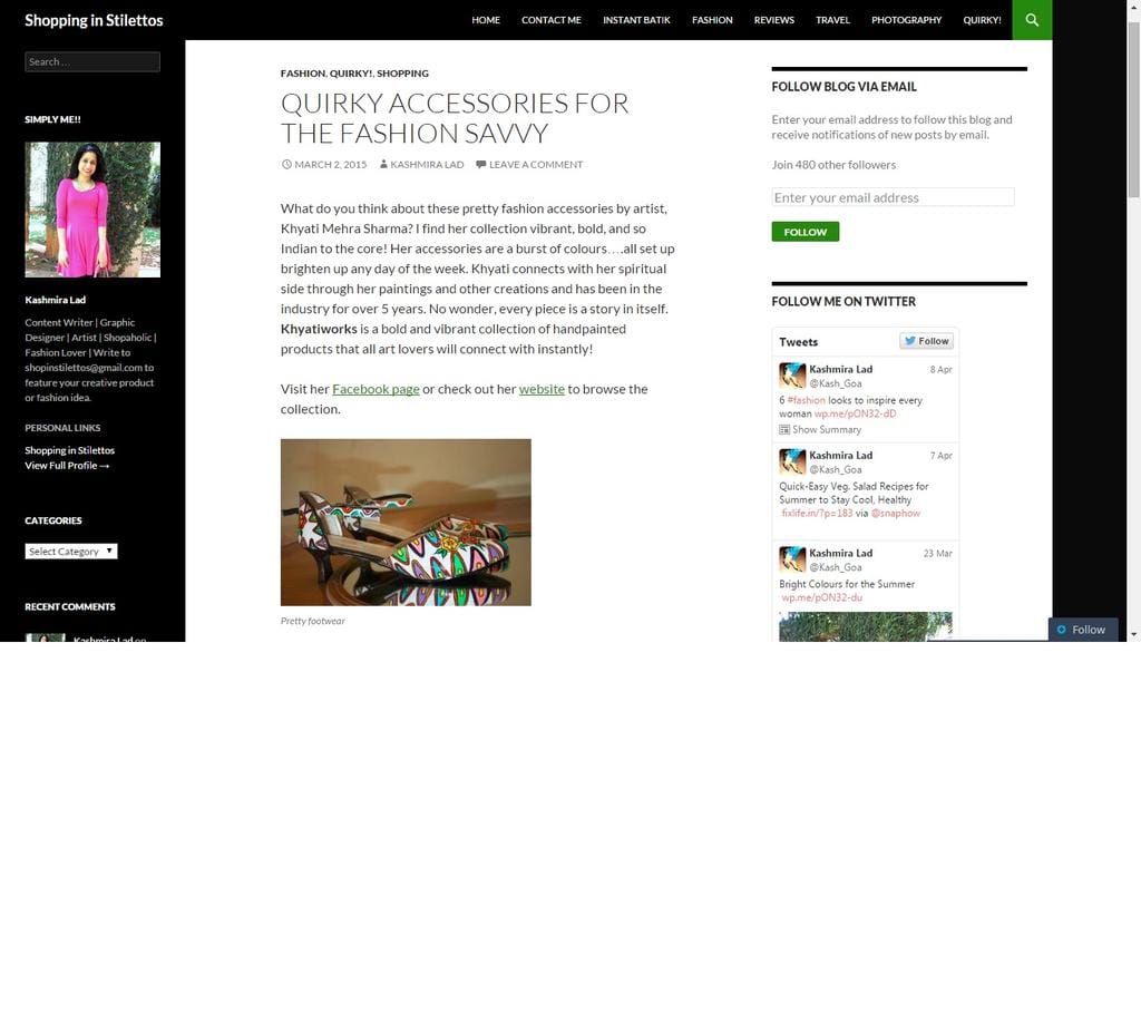 3rd Mar'15 - Khyatiworks is written about by 'Shopping in Stilettos' Blogger Kashmira Lad!