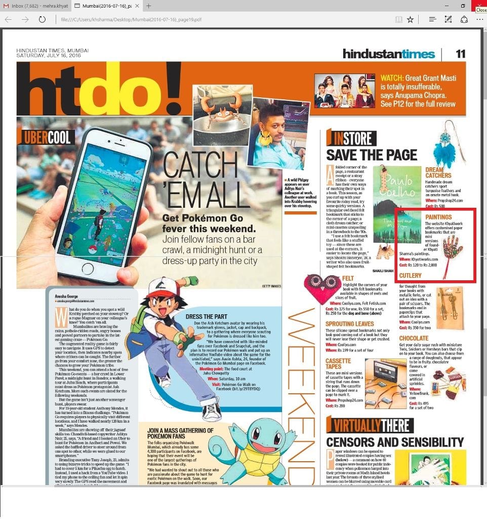 16th July'16 - Khyatiworks Haath-ee Bookmark published in Hindustan Times Mumbai Edition!