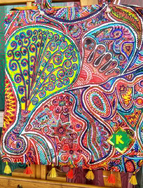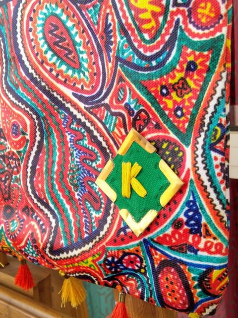KHYBAG021This is a laminated canvas tote bag which is completely hand stitched. It has a cotton fabric lining and 2 small pockets inside for keeping your little stuffs. This bag has a zip closure and its straps are also made of canvas and embellished with crochet buttons. There are tassels at the bottom of the bag. You can wipe it clean with wet cloth.