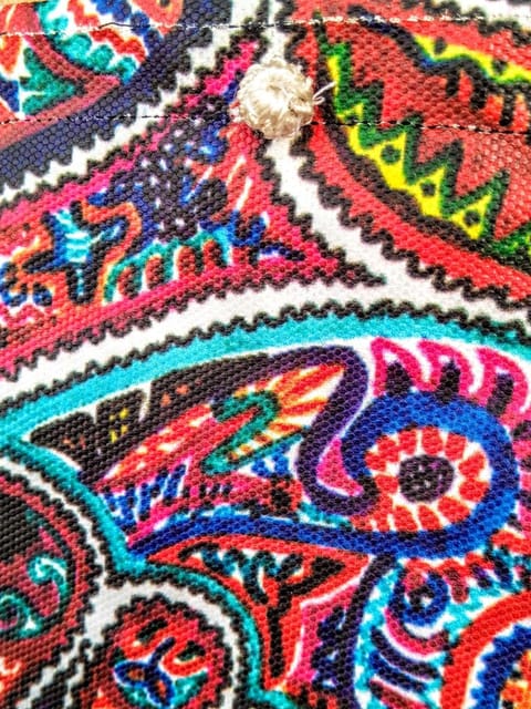 This is a laminated canvas tote bag which is completely hand stitched. It has a cotton fabric lining and 2 small pockets inside for keeping your little stuffs. This bag has a zip closure and its straps are also made of canvas and embellished with crochet buttons. There are tassels at the bottom of the bag. You can wipe it clean with wet cloth.