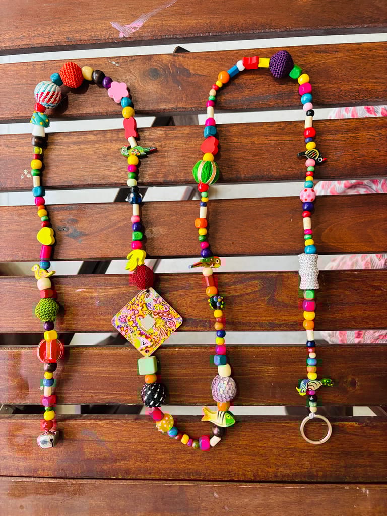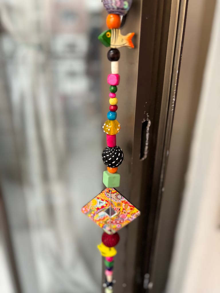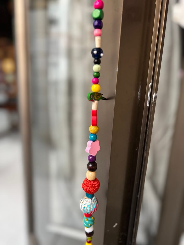 Add a splash of joyful color and handmade charm to your space with this stunning, one-of-a-kind beaded wall hanging. Handcrafted with love and bursting with personality, this eclectic piece is made using a beautiful mix of wooden beads, crochet buttons, wool elements, tiny hand-painted birds, bells, and other playful charms.