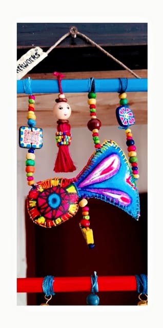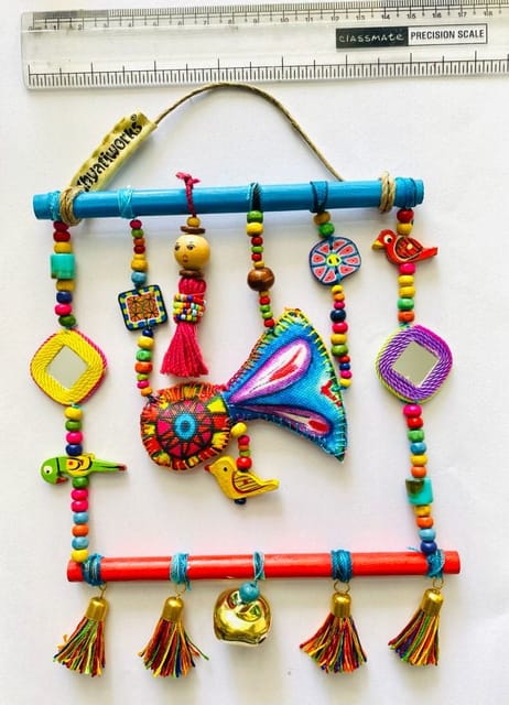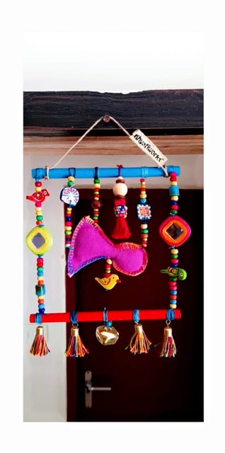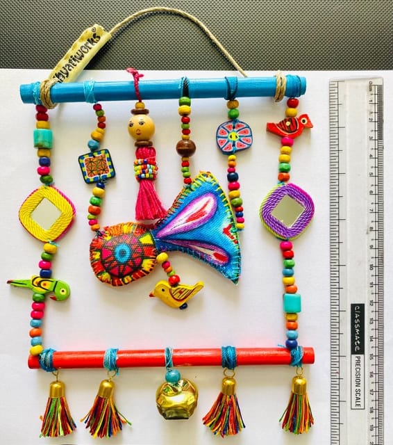 This mini hanging is made using wooden beads, clay pieces, charms, mirrors and bells.