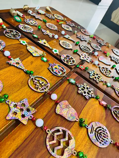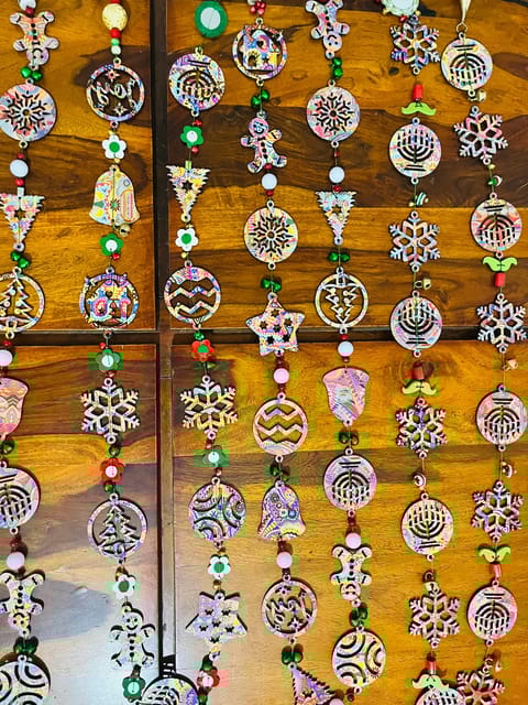 Ghungroos, mirrors, wooden snowflakes shapes, wooden candles shapes, metal embellishments, bells and it goes on and on.